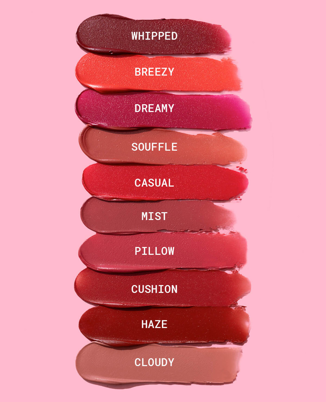 Dimethicone, Isononyl Isononanoate, Diisostearyl Malate, Dimethicone/Vinyl Dimethicone Crosspolymer, Vinyl Dimethicone/Methicone Silsesquioxane Crosspolymer, Tribehenin, Polyglyceryl-2 Triisostearate, Simmondsia Chinensis (Jojoba) Seed Oil, Phenoxyethanol, Tocopheryl Acetate, Caprylyl Glycol, Sodium Hyaluronate, Ethylhexyl Palmitate, Silica Dimethicone Silylate, Butylene Glycol, Hexylene Glycol, Titanium Dioxide (CI 77891), Iron Oxides (CI 77491), Iron Oxides (CI 77492), Iron Oxides (CI 77499),Manganese Violet (CI 77742),D&C Red No.6 Ba Lake (CI 15850),D&C Red No.7 Ca Lake (CI 15850),D&C Red No.21 Al Lake (CI 45380),D&C Red No.27 Al Lake (CI 45410),FD&C RED NO.40 Al LAKE (CI 16035),FD&C Yellow No.5 Al Lake (CI 19140)